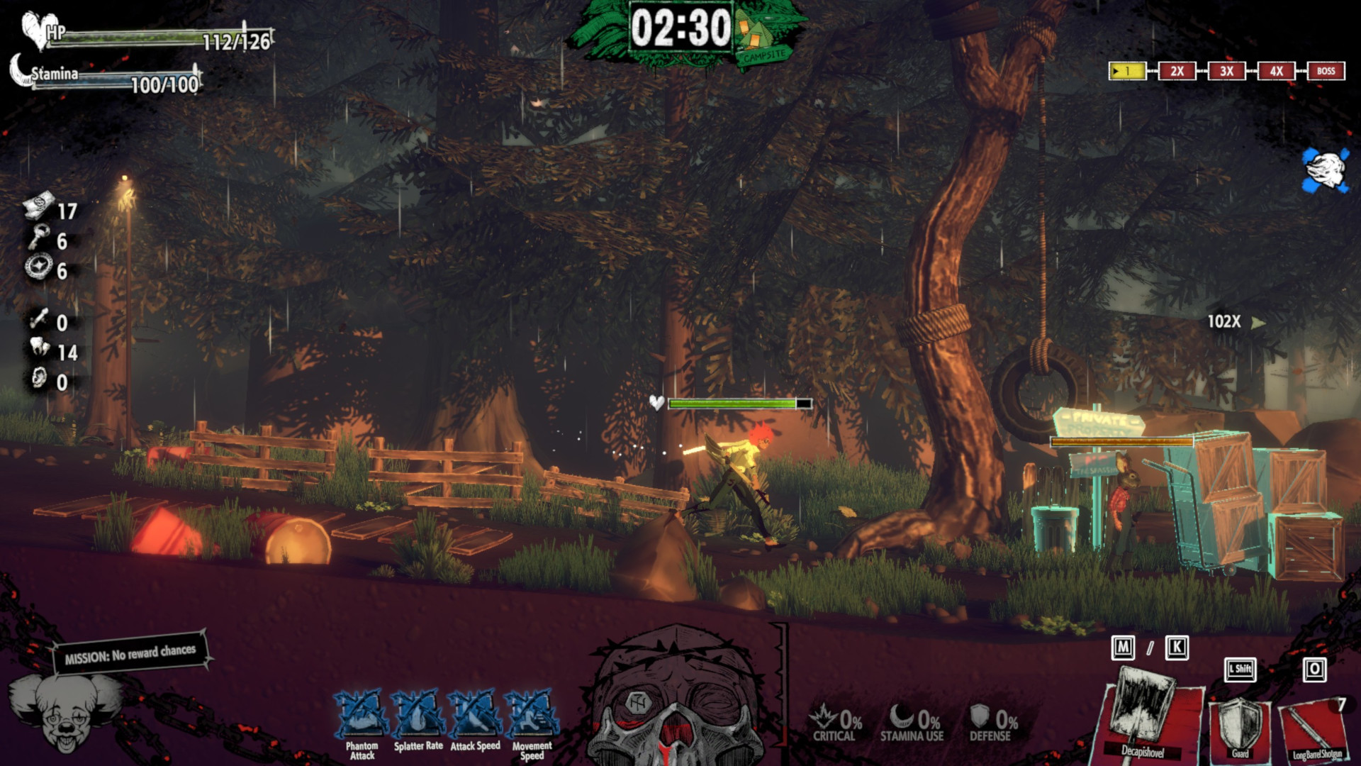 Puoi rendere le tue armi leggermente più efficaci usandole secondo determinati criteri, ma non sono mai abbastanza sostanziali da fare una grande differenza. Usa il coltello “Bloody Slicer” quando piove, per esempio, e otterrai un +2% di probabilità di colpo critico quando piove, mentre l’ascia “Massacre Chopper” ti dà un +5% di difesa quando sei affetto da un disturbo. È il solito vecchio problema dei roguelike: non far percepire i potenziamenti come realmente importanti. Non li ho notati minimamente, quindi ho finito per prendere quello che mi sembrava meno doloroso da usare.