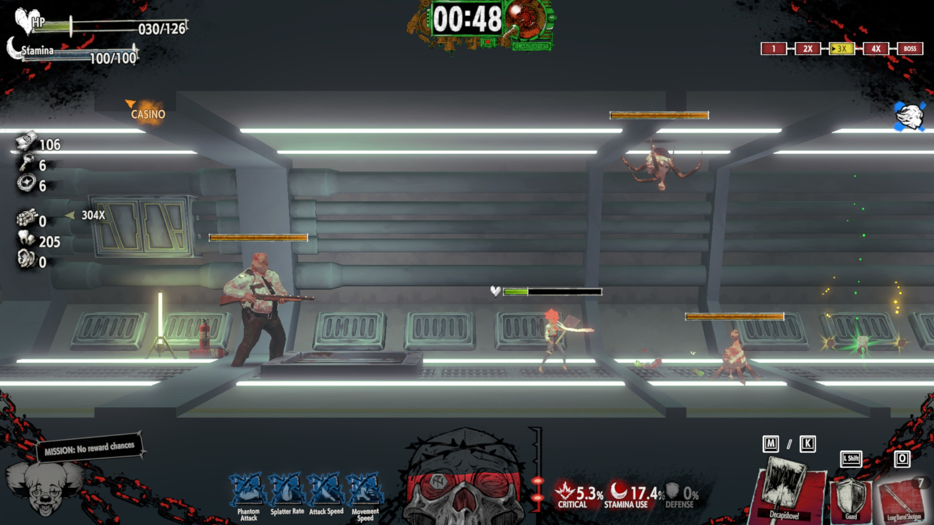 I combattimenti contro i boss, nonostante i boss stessi siano cliché horror trasformati in imponenti golem di carne, sono l’aspetto più interessante di questo gioco. Le tue precedenti partite vengono registrate, come i fantasmi in un gioco di corse, e combattono al tuo fianco come parte di un sistema chiamato Slasher Phantom. Questo ti permette di accumulare le tue partite, il che mi ha aiutato a superare più combattimenti contro i boss. Se esegui un attacco speciale in una stanza con un boss e poi muori, continuerai a essere utile per le tue partite future. Ti aiutano per tutta la partita, il che può rendere un po’ più facili anche i livelli più sbilanciati di questo gioco.