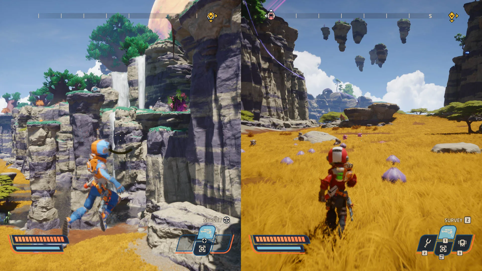 Ma la direzione artistica del gioco mantiene una gerarchia visiva e una chiarezza spaziale sufficienti a mantenermi orientato, pur essendo costantemente bombardato da emozioni forti. Ogni pianeta è visivamente distinto; si inizia con una spiaggia serena e giungle, per poi passare a deserti sabbiosi e dune, a caverne di ghiaccio cristallino e altro ancora.