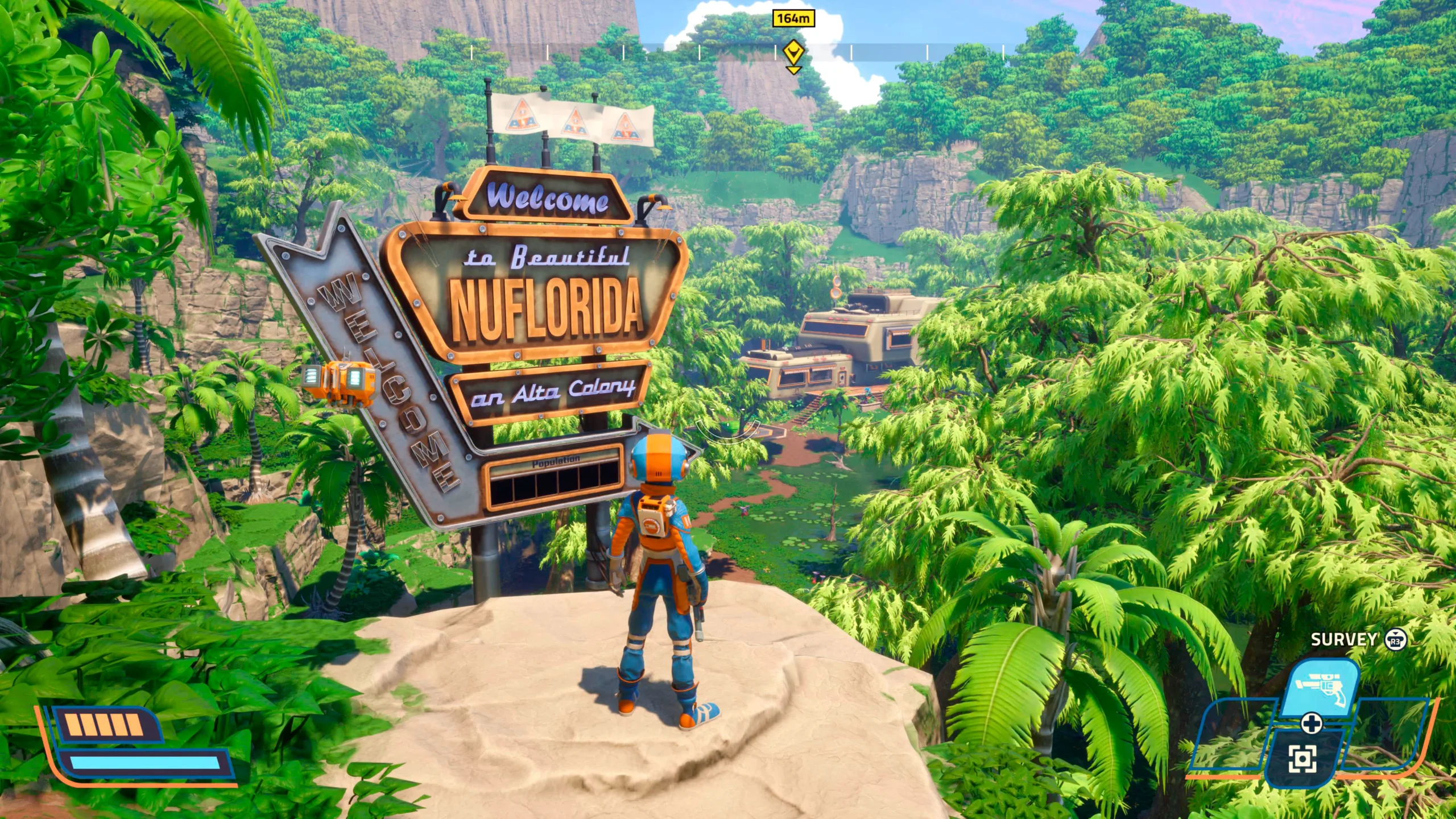 RotSP è pieno di battute, pubblicità false e assurde e cose strane. È un mondo fantastico con tantissimo da esplorare. All’inizio non puoi raggiungere tutti gli oggetti collezionabili o le risorse, perché ti mancano gli strumenti, ma la mappa ti dice anche quali oggetti collezionabili puoi raggiungere al momento e quali no.