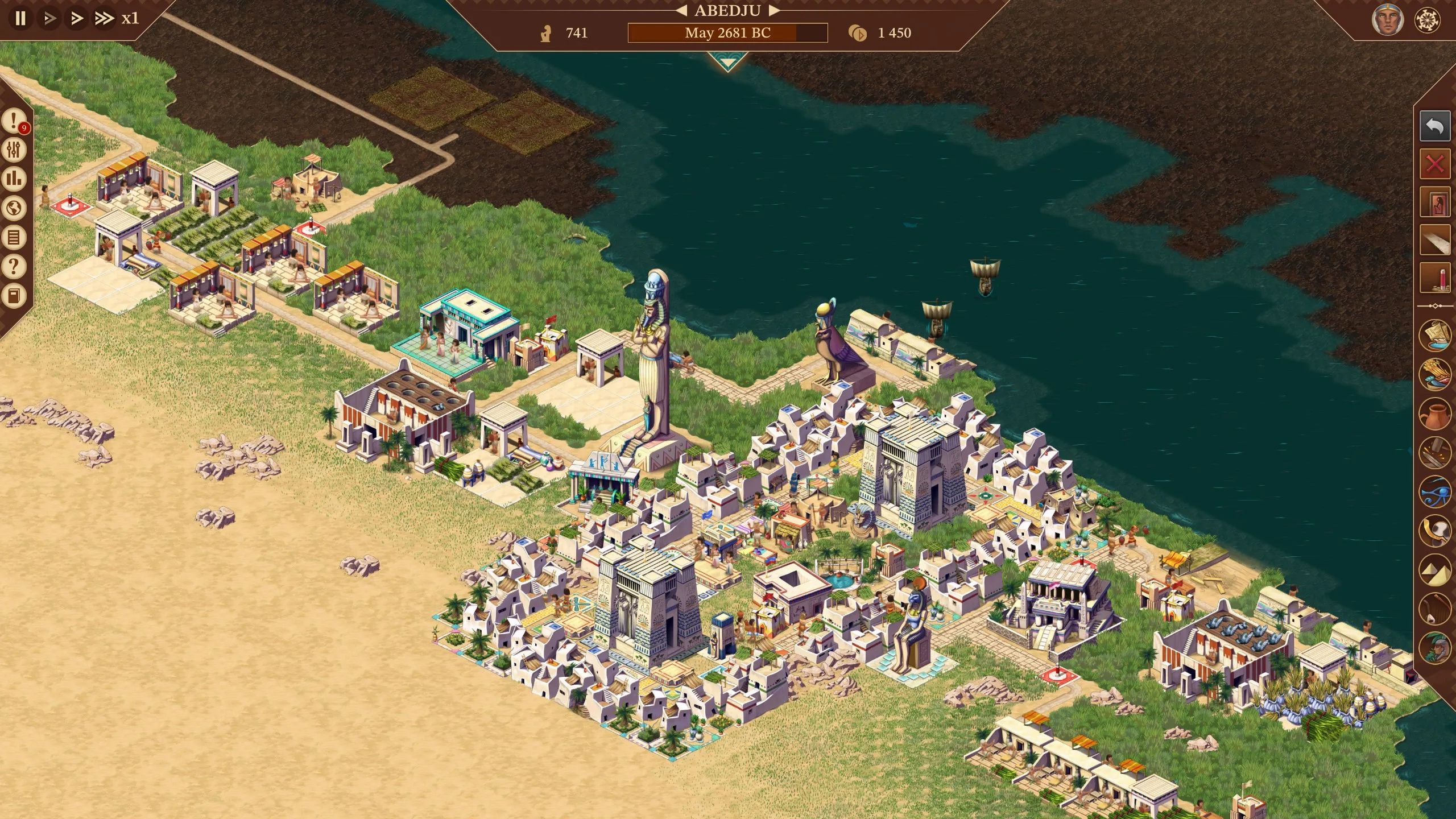 La mia caratteristica preferita di Pharaoh è il Nilo. In altri city builder si designano aree per l’agricoltura, oppure si piazzano le fattorie in zone fertili caratterizzate da un leggero manto erboso. In Pharaoh si coltiva nella pianura alluvionale del fiume, con i lavoratori che raccolgono febbrilmente prima che le acque si innalzino e depositino altro limo ricco. Ci si ritrova naturalmente a impostare catene di approvvigionamento che funzionino al ritmo di questa crescita e diminuzione. A New Era aggiunge un indicatore di nilometro, così da poter monitorare la stagione delle inondazioni e quanto sarà fruttuosa, permettendo di pianificare i periodi di magra.