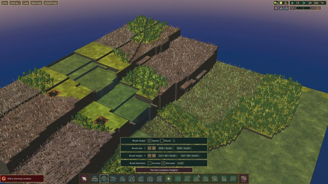 In questo mondo basato sui voxel (se vi state chiedendo cos’è un voxel, sappiate che è la controparte tridimensionale del pixel), puoi costruire terreni ad altezze variabili, l’unità più piccola è un singolo blocco, ma puoi cambiare il “pennello” per creare facilmente montagne o canyon. Puoi anche aggiungere vegetazione alla mappa, che a prima vista sembrerà morta. Inserisci la fonte d’acqua.